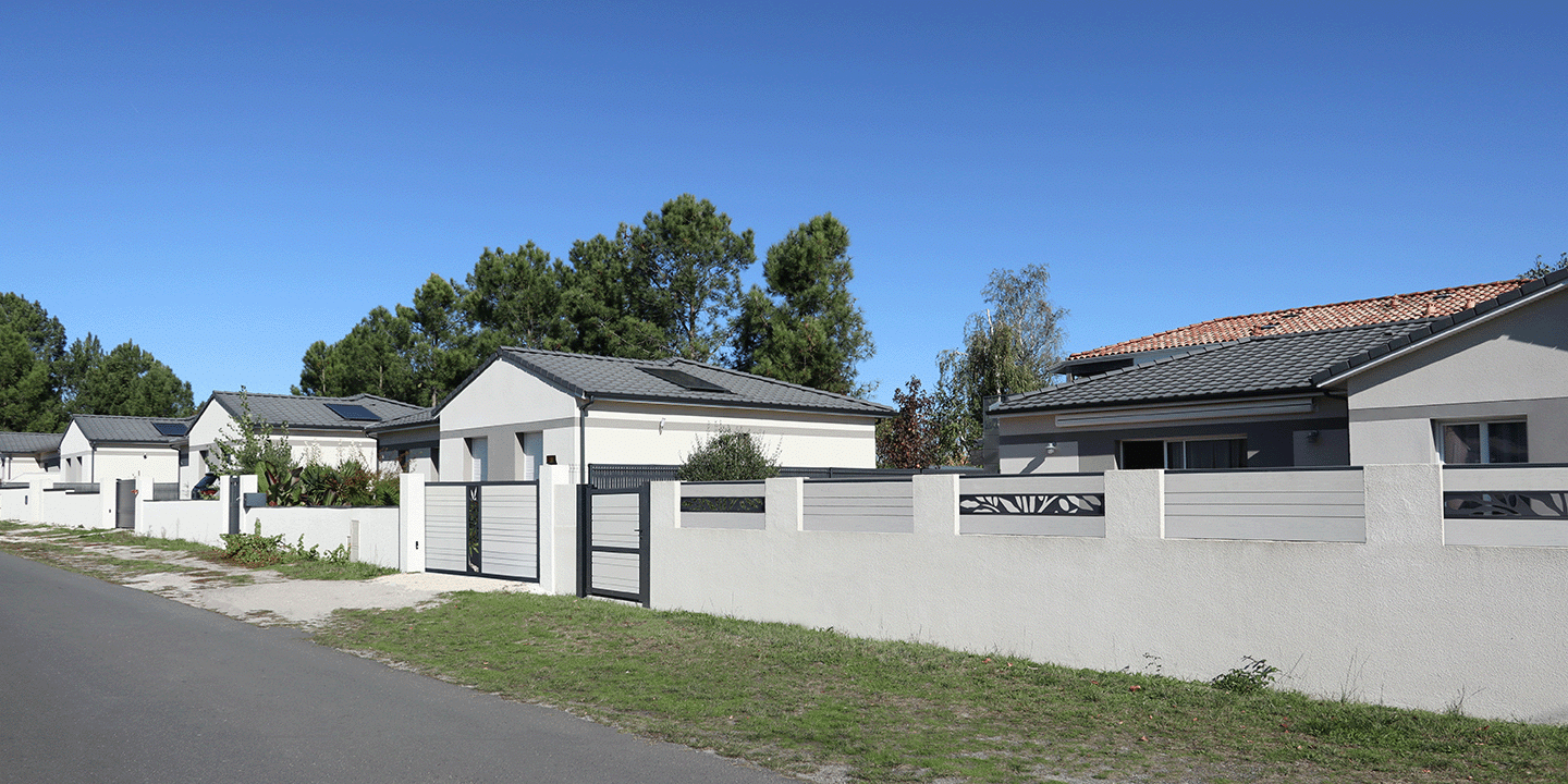 Le gris clair apporte de la lumière à votre aménagement extérieur indémodable ! Cerné de Gris 7016 pour lui donner un peu de caractère, et agrémenté de lames décoratives de même couleur (ici un motif « Olivier »), il s’associe parfaitement à une maison des années 2000. Ici le portail coulissant a aussi été choisi avec une lame décorative centrale, de même motif que la clôture, mais disposée à l’horizontal.